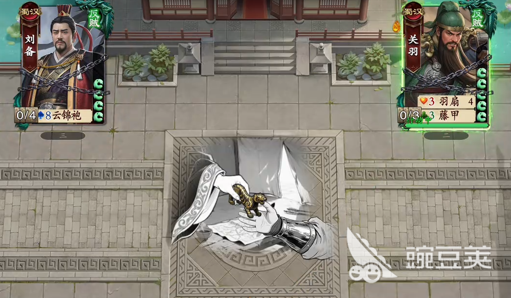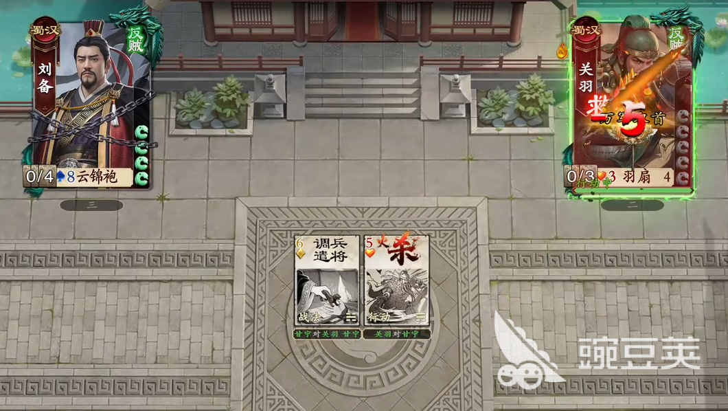 此时,“万军取首”配合【藤甲】与【羽扇】的火属性加成,合计造成5点真实伤害。紧接着,发动甘宁主动技“锦帆游侠”,摸取两张【杀】,分别对关羽与刘备各使用一张。在伤害结算后,两名敌将将同步阵亡。系统判定仅需我方角色存活(含1点血量),即视为通关成功。