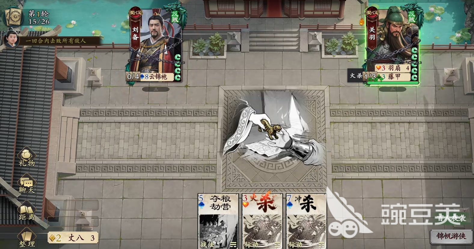 需特别注意:甘宁另一技能“百人夜袭”在此关中完全不可启用,操作时务必点击取消。若意外触发,仅允许弃置【云锦袍】,其余手牌(如【夺粮劫营】、【杀】等)均承担核心战术功能,任何误弃都将导致流程中断。
