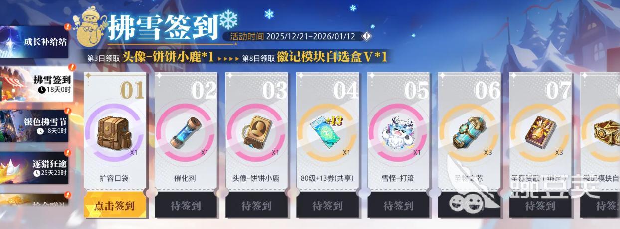 活动首推「拂雪签到」系统,连续登录即可逐日领取丰厚资源:限定节日头像“饼饼小鹿”、80级装备专用加13强化券、圣物之芯及徽记模块自选盒等关键养成材料。此类道具可直接提升战力构建效率,尤其对中后期角色成长具有显著推动作用。