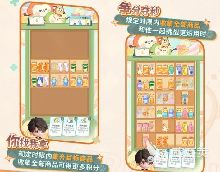 活动流程分为四大环节:首先进入超市场景,与夏以昼协作整理货架;随后进入“商品收集挑战”关卡,完成指定目标;接着创建个性化Q版角色,并与夏以昼组成搭档;最后进入主线剧情,共同参与宠物救助主题的公益赛事任务。