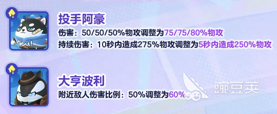 角色强度方面,投手阿豪获得显著强化:基础物攻由三段均为50%提升至75%、75%、80%;持续伤害机制同步优化,原10秒内累计270%物攻伤害调整为5秒内达成250%物攻输出。大亨波利的范围压制能力增强,对邻近敌方单位的伤害比例由50%上调至60%。