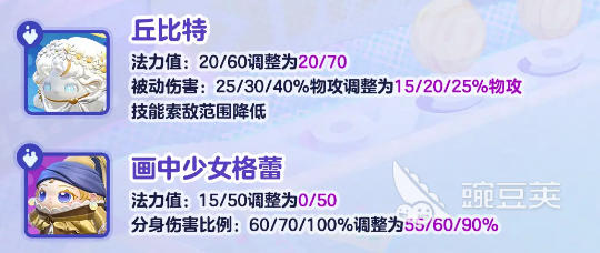 丘比特与画中少女格蕾则面临多维度削弱。丘比特法力值消耗由20/60调整为20/70;被动技能三阶伤害比例由25%/30%/40%物攻下调至15%/20%/25%物攻;同时索敌判定范围收窄。格蕾初始法力值从15/50变更为0/50;分身所造成伤害比例由60%/70%/100%物攻降至55%/60%/90%物攻。