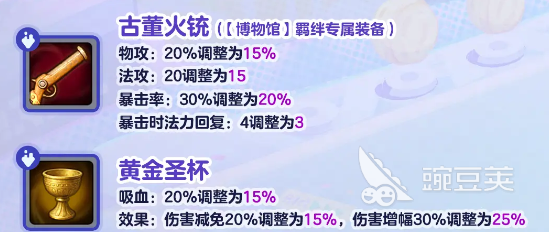 黄金圣杯吸血效果由20%下降至15%,伤害减免由20%压缩至15%,伤害增幅由30%缩减为25%。羁绊方面,刚毅法师四阶法攻由20/50/85/120提升至25/60/100/150;肉蛋提供的全队生命力加成由100点增至150点;双黄蛋第二次技能伤害比例由35%/60%/100%上调为45%/75%/120%;刚毅战士吸血率由15%降低至10%。