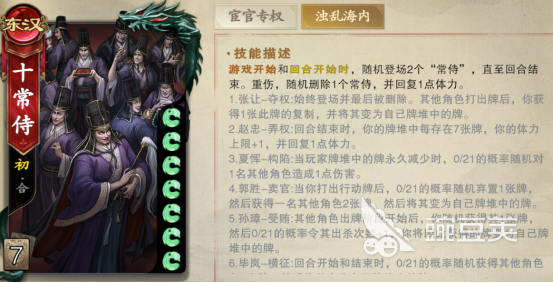 其次就是浊乱海内,这属于独特的核心技能,回合开始会有两个尝试登场,每个尝试都有具体的对应技能,在重伤的情况下,可以直接删除,尝试回复体力。所以想要将其击败,并没有那么简单容易,10个常侍轮流更换技能,整体的玩法是比较有趣的。通过打出闪,张让就能够得到闪,随后张让的手牌就会变得越来越多,让技能大幅度增加。在十城市当中,赵高可以用灵智打,推荐小伙伴们使用刘备和关羽这样的搭配,关羽出招能够得到杀,基于目标杀数量提升伤害,而刘备属于辅助,自己并不会出牌,而是将自己的手牌给关羽。