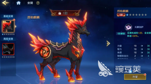 首先登场的,那自然就是烈焰麒麟,这就是金色品质的坐骑。作为基础坐骑,并不需要复杂的解锁条件,上线之后马上就可以激活,对新手玩家还是很友好的。烈焰麒麟在初始状态下就会有智力,力量,还会有体质属性加成。魔法攻击力,还有物理全部都会同步提升,搭配三维双攻的全面增益,自然就可以填补当前的战斗力空缺。当坐骑升级到一阶时,就会解锁被动技能元素加护,性价比更是直线飙升。有30%的骑乘移动速度,不管是跑图探索还是副本转场,都是比较高效。