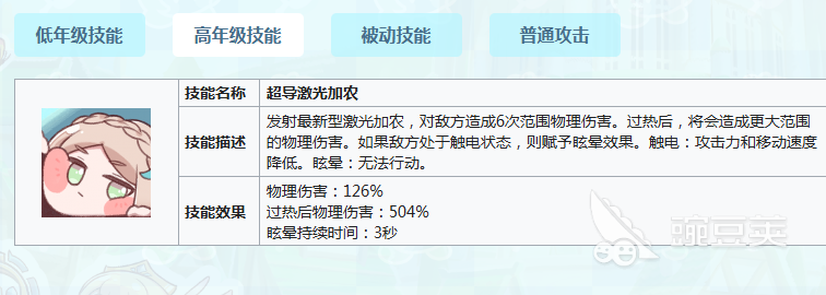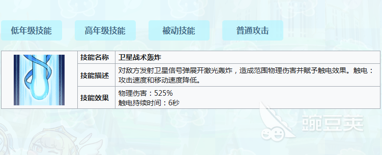 他的技能主要就是围绕两个,一个是触电控制,另外一个是范围伤害,会形成完整的战场压制链。普通攻击看似比较简单,但在基础的状态下就可以直接发射激光,然后造成范围性的物理性伤害,在经过强化之后,还会有概率附加触电效果,降低敌人的移动速度还有攻击力,可以给团队创造出更有利的环境。低年级技能卫星战术轰炸,又被称之为控场的利器,会有525%的范围物理伤害,并且还会搭配6秒的触电效果,一瞬间就可以打乱敌方的阵型。