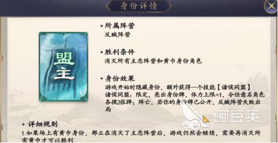 其次就是反贼阵营共拥有4种身份,主要的目标就是消除所有主中阵营中的角色,其中反贼是隐藏身份,击败反贼角色可多摸三张牌,还有盟主及军师,其中盟主亮出身份之后增加一点体力,并让其他角色进行摸排。军师隐藏身份,具有锚定天下的特色技能,亮出身份之后,随机获得三张战法牌。先锋也是隐藏身份,亮出身份之后,可以与一名角色交换位置。其他阵营也包含4种。