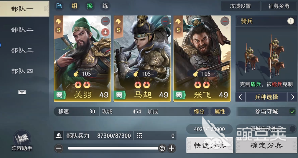 不喜欢这种经典搭配的玩还可以选择让马超和曹操,公孙攒组建成一支队伍,这支队伍非常适合野战,角色的控制比较灵活,整体的输出能力也很优秀,可以从前期一直用到后期,角色的能力虽然不如五虎队,但每一个成员的获取难度都会更低,如果新手获取了这三个角色,那就可以把他们几个搭配在一起。