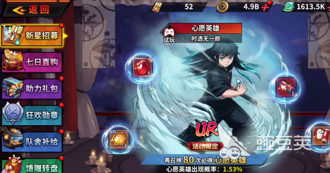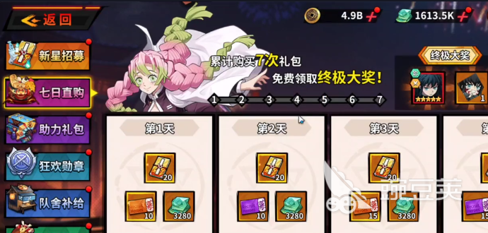 作为这一次更新的核心福利,无一郎的获取渠道还是比较丰富的。首先比较稳妥的就是保底机制,游戏的活动限定招募池已经开启,累计80发招募就能够获取本体,同时也可以解锁首款的限定皮肤,这一款皮肤主要是以星辰设计作为灵感,黑色基底加上银蓝色的星纹,然后点缀流光的特效,在战斗时还会触发专属的粒子效果,成为收藏党的主要选择。如果想要凑齐更多的皮肤,还可以参与7日直购活动。连续7天参与直购,不需要额外的消耗招募券就能解锁限定皮肤。