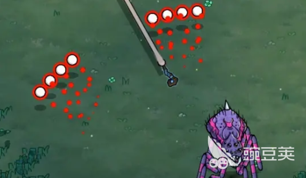 第二种攻击方式为合并弹幕攻击。巨蛛发射出五个弹幕,然后合并成一排向外面扩散。对付该种攻击方式的最佳方法就是和巨蛛保持一定的距离。当巨蛛准备发射弹幕的时候,玩家要根据情况及时走位、闪避,就可以有效地应对并且降低受到攻击的风险。