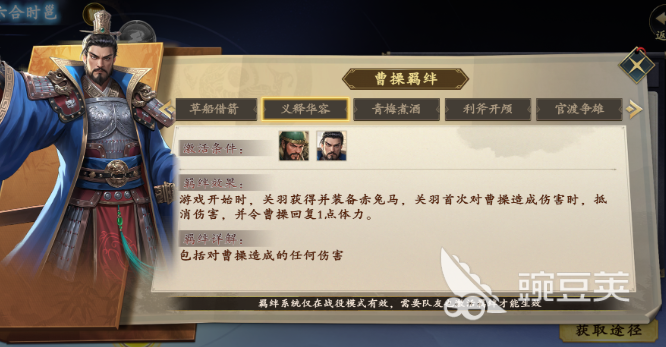 不同羁绊的实战效果会有所区别,可以先看一些实用性比较出色的组合。例如曹操和诸葛亮有草船借箭的战术技能,诸葛亮在第1次受到曹操手牌伤害时,就可以抵消伤害,然后获得这张卡牌。例如剑雨骑射技能攻击时,诸葛亮就可以直接触发羁绊,把这一张群攻牌收入囊中,然后第2次使用。曹操和关羽的义释华容,这主要是偏向于辅助联动,关羽在开局时就可以直接装备司马兔,回合开始之后就能多摸牌。