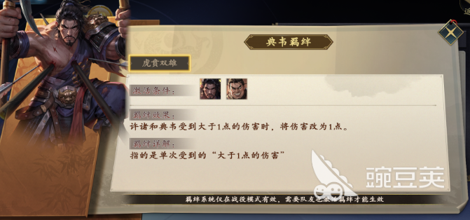 生存向羁绊中,典韦以及许诸的羁绊也需要注意。这一对组合就会受到单次大于一点伤害时自动下降为一点伤害。面对赵高这一类高伤的boss时,就可以较大的提升队伍的容错几率,再也不担心被瞬间秒杀。还有张飞相关的桃园结义羁绊,不仅可以让羁绊武将体力上升,更关键的是还可以回复所有成员的体力。哪怕是重伤救援的体力,在恢复时照样也可以触发,所以用刘备给张飞关羽持续的回血,那整个队伍的续航能力都可以得到保障。