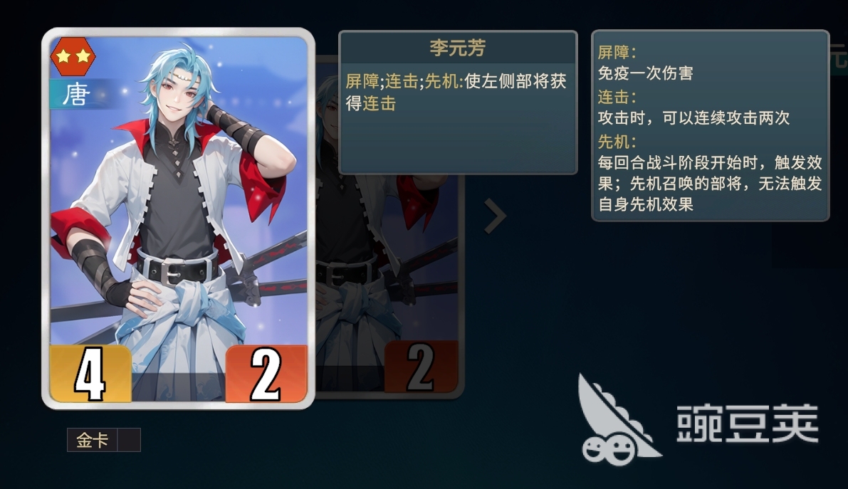 李元芳是同时拥有屏障、连击和先机三种机制的部将,同时他的星级仅为二星,在开局阶段就能轻松拿到手。再加上李元芳的先机能力是登场就能为左侧部将添加连击能力,也令他成为主输出部将极为合格的挂机,可让主输出部将在一次行动中通过连动尽可能地击杀掉更多敌方部将,为己方阵容获取优势,若是碰巧与敌方大哥部将对位,甚至能直接将敌方大哥带走,也显得李元芳的先机有着极高收益,这也为李元芳连击流提供了组建基础。