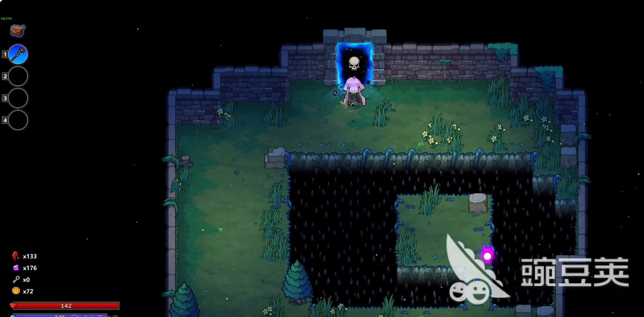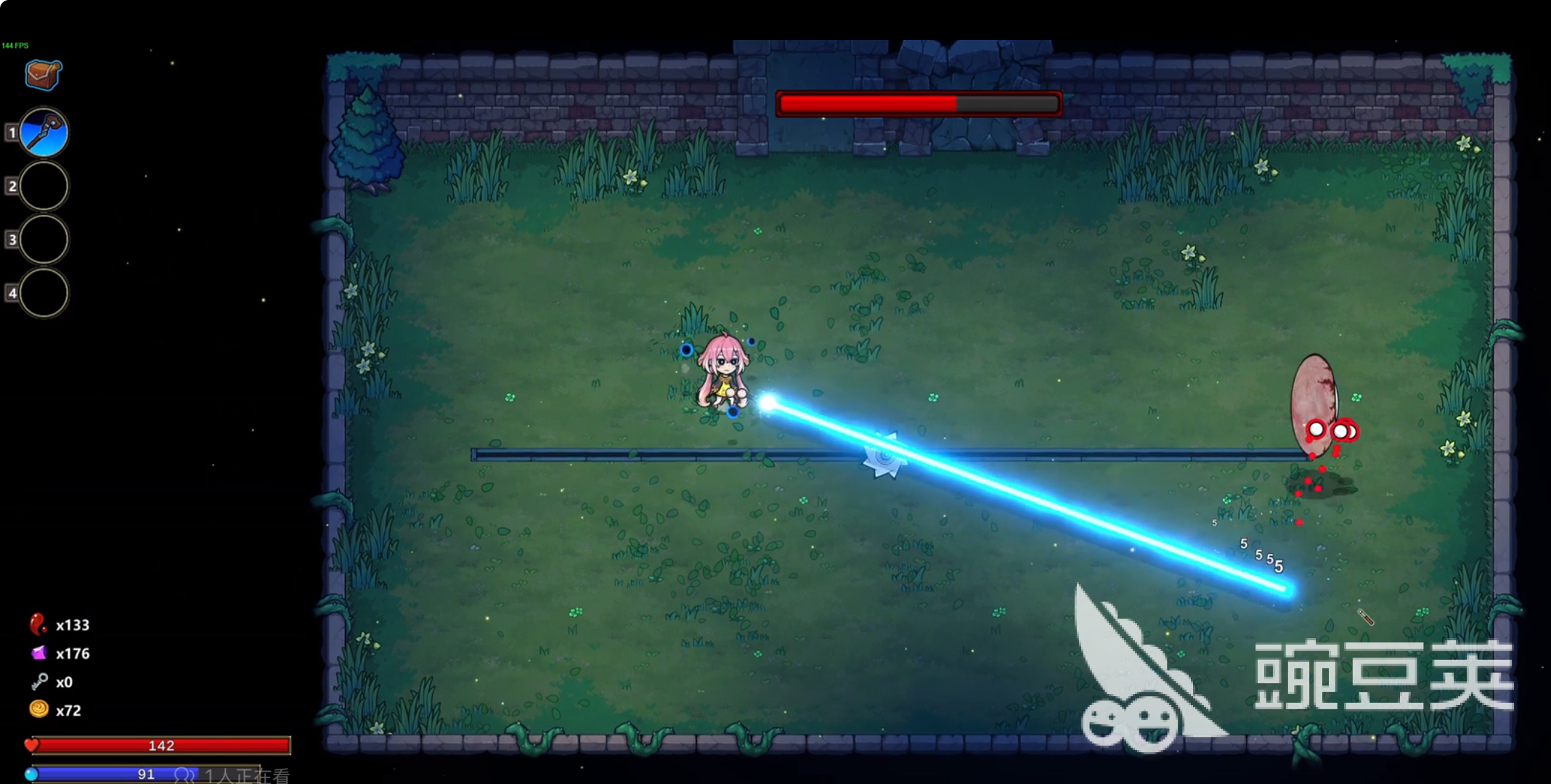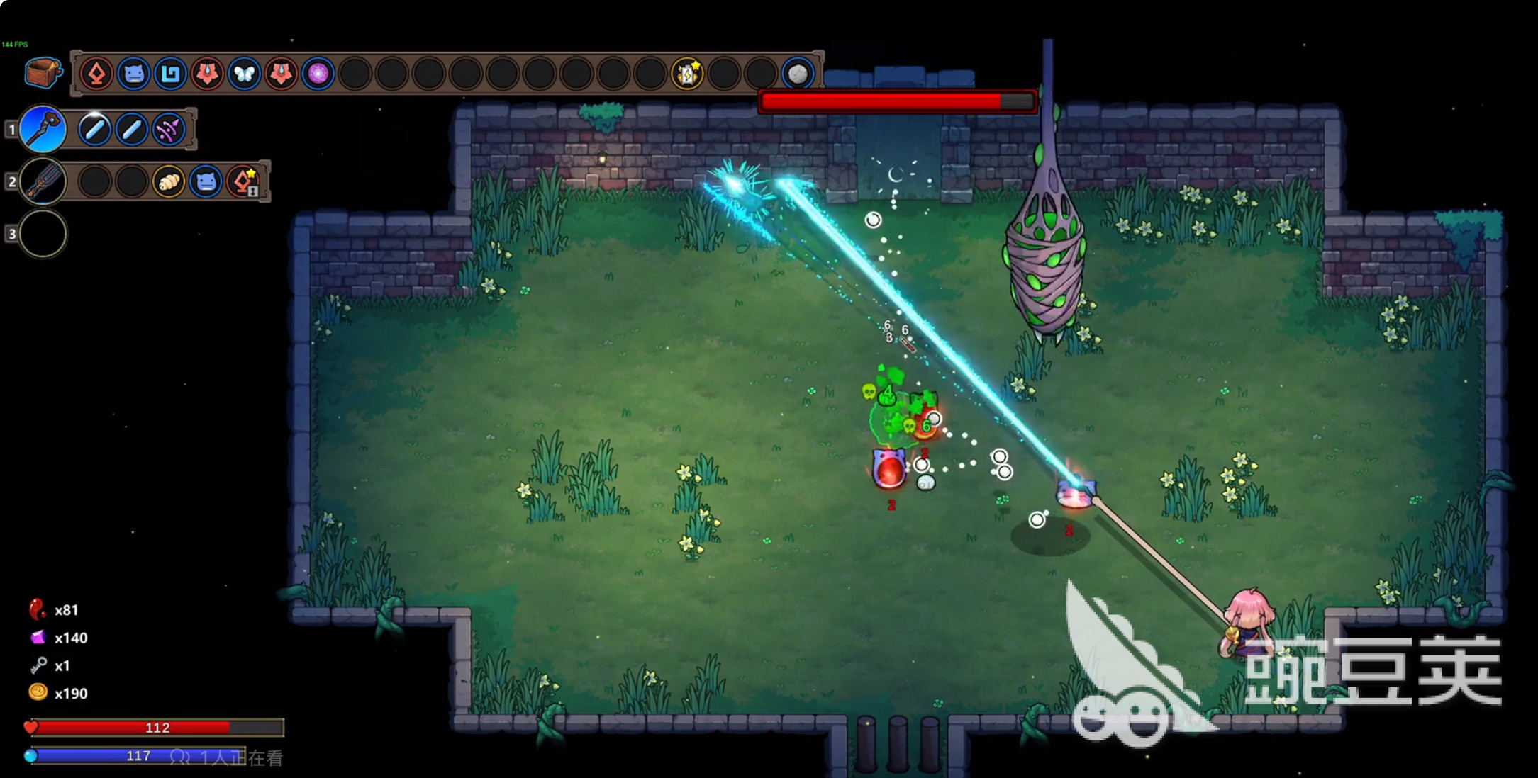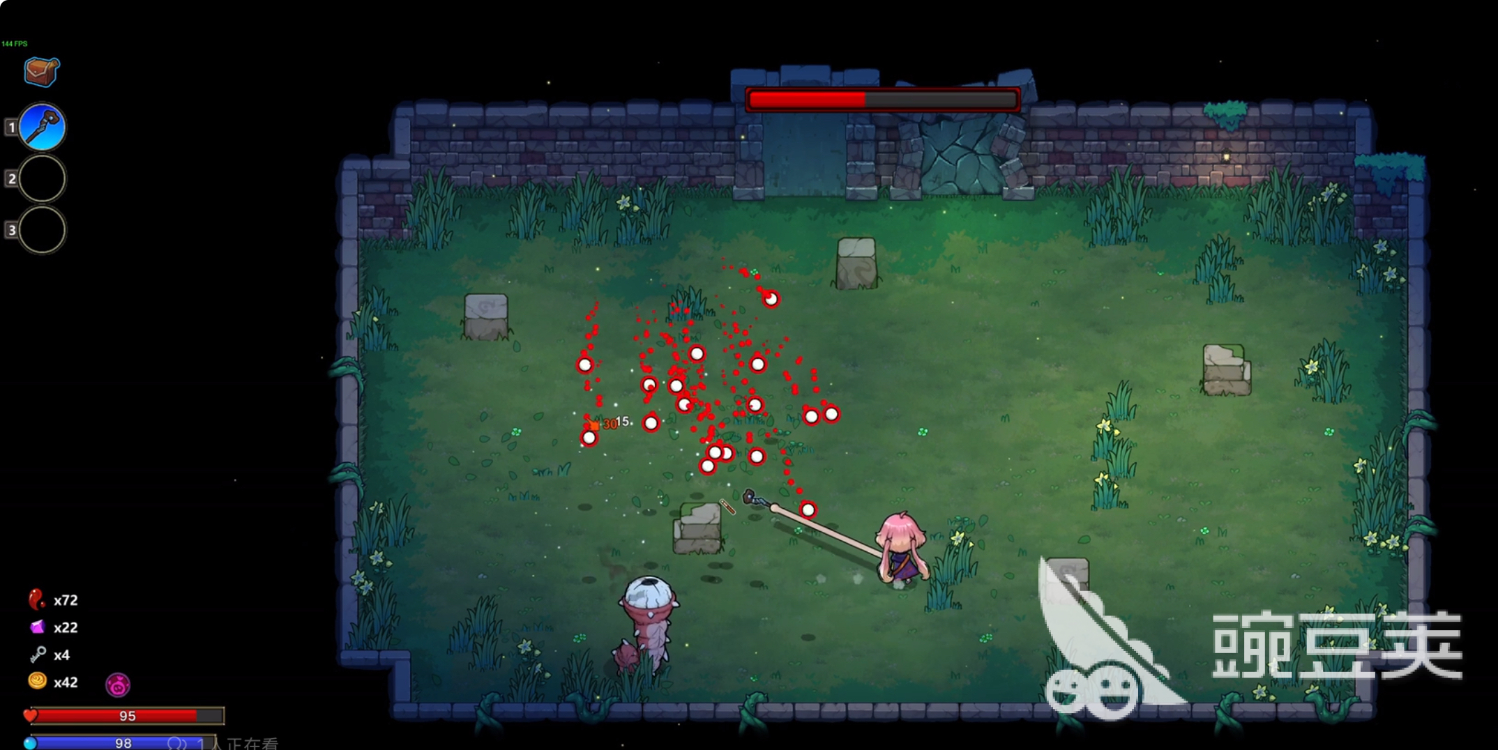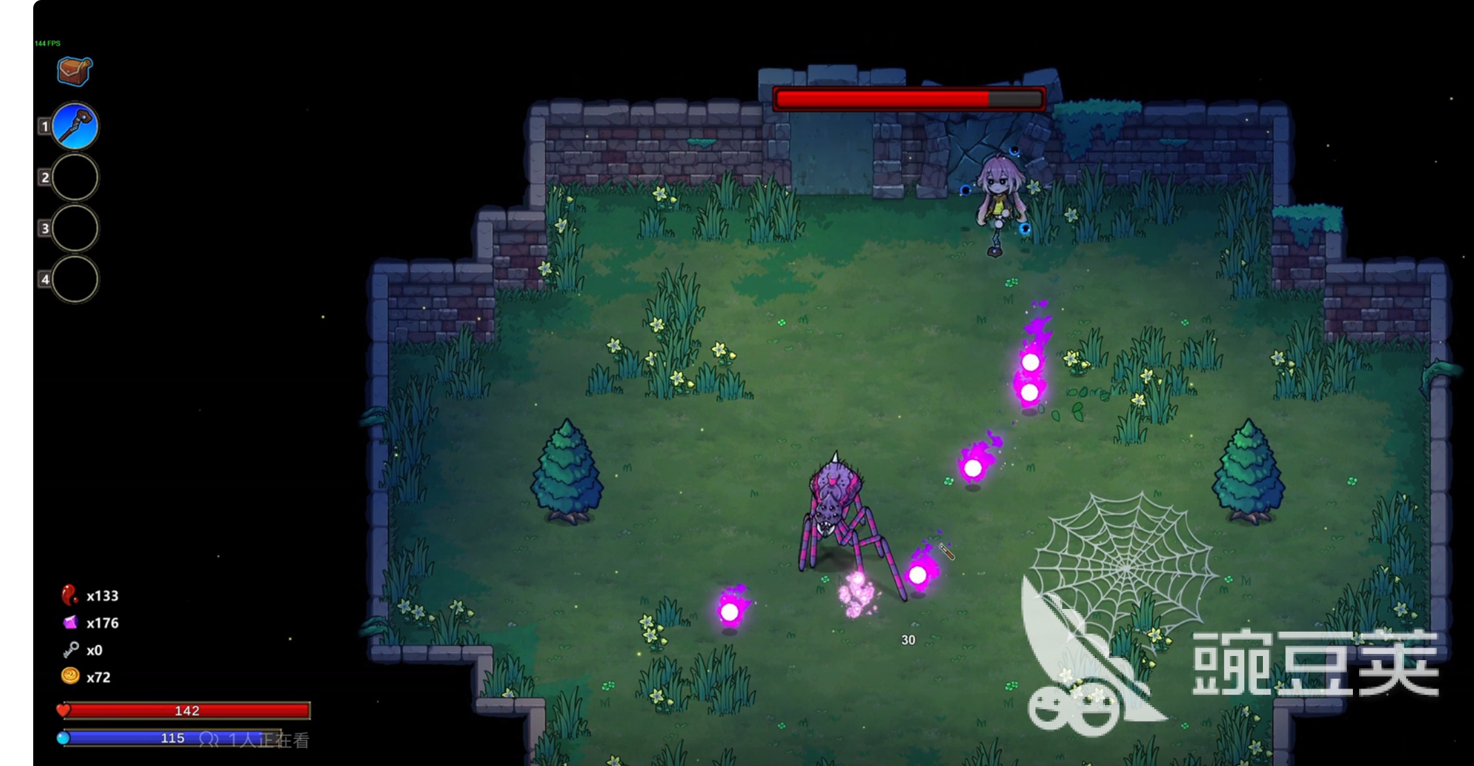 第一个精英怪:巨蛛,它的生命值是650,有三种攻击方式,第一个是发射8个弹幕,会从两个角度向外扩散,但中间是空的,我们只需要站远一点就可以躲掉了。第二个攻击方式是发射一排的弹幕,我们还是用走位和距离来进行躲避就可以了。第三种攻击方式是蓄力,会吐蛛网球,被击中之后会受到伤害值,蛛网球落地之后会成网,踩中的话就会被减速。我们需要提前预判蛛网球的落点,然后避开就可以了。总的来说,巨蛛难度不高,而且它血量低,我们用走位把它堵在角落里打败就可以了。