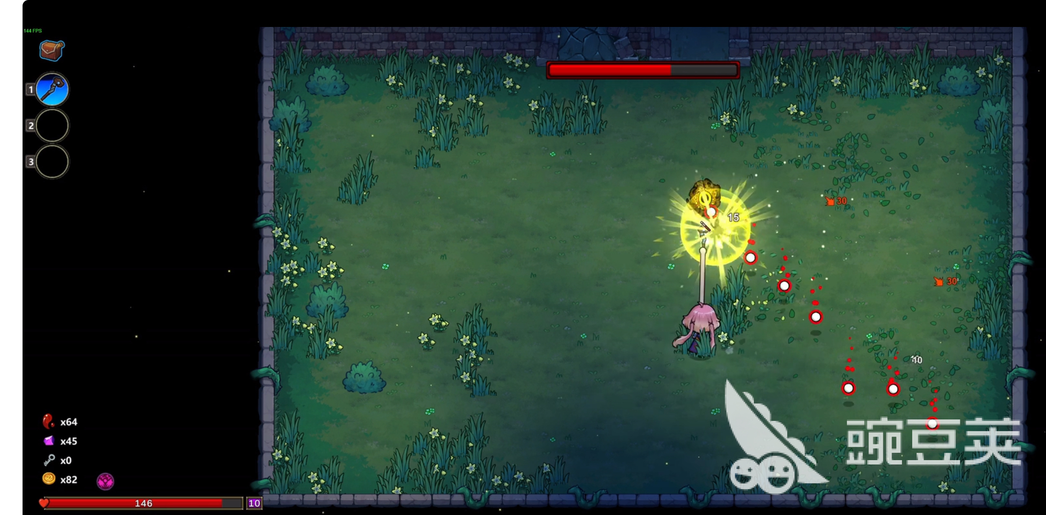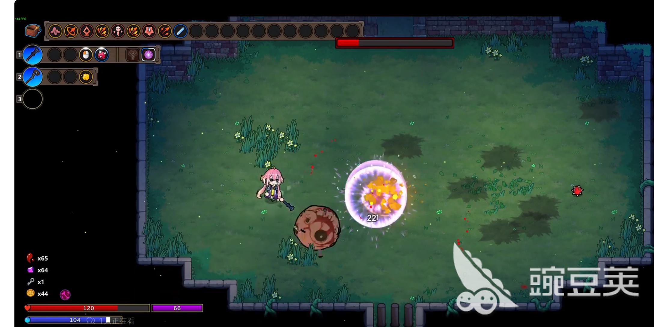第五个是个boss,无序残骸,血量有1700,有三种攻击方式,第一种是会不停的冲我们滚过来,而且速度特别快,撞墙之后还会喷出弹幕,这个就只能通过走位来躲避。第二种攻击方式是跳起来在空中旋转之后向我们滚过来,然后撞墙之后喷出大量的弹幕,还是通过走位来躲避。第三种攻击方式和第二种一样,只是在冲过来的过程中会加速,我们依然还是靠走位来躲避伤害。这个boss很容易破无伤,而且弹幕发射很多,不过伤害值不是很高,我们可以躲在右下角和两个方框处,用走位躲避就可以了。