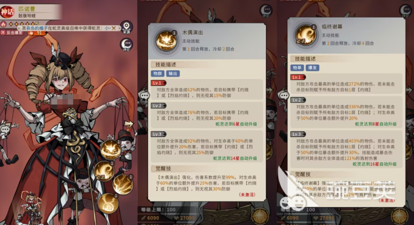 如果大家想要用纯火队来开荒的话,这里可以用到的有红帽外婆、匹诺曹、三小恶魔、小小红帽、小猫莉娅以及法海这几个角色组合,在这个纯火队里面开放阶段,大家抽出来的角色的概率也比较大,那么在其中大家用匹诺曹,就可以用他的技能来解决了一些对群的伤害,而且自身的反击伤害次数也不低,所以在纯火队当中匹诺曹可以优先用来锁定C位的,这样角色进行输出而且带来的溅射类型伤害数值也是比较高的,用他来攻击处于灼烧状态加成当中的敌人会带来的一个额外增伤能力,这也导致整个阵容的持续输出也是非常不错的。