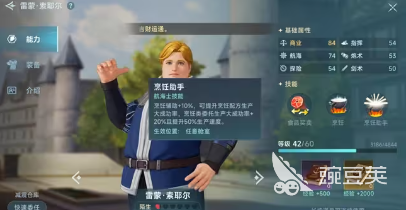 另外这里还为大家推荐的还有一个厨师类的航海士,厨师雷蒙,在游戏当中作为一个特殊类别的航海士,他在技能效果上面主要是安放在船上,可以带来烹饪类型的加点,在技能效果上面可以带来一点厨艺加成之外,他的三技能还可以给烹饪辅助带来10%的提升成功率,也就是说大家在研究各类配方的时候,雷蒙能够带来的成功生产概率是会更高一些,而且在目前通过这样的委托生产当中,提升20%之后的成功率可以让大家在整体的生产速度上面有50%的提升,所以目前这类有烹饪效果提升的航海士还是比较缺少的,所以厨师雷蒙为了这团队进行加成的时候,他虽然只是一个辅助类型的航海士,但是用处是非常多的,后期在船上他可以走的路线是烹饪加上钓鱼。