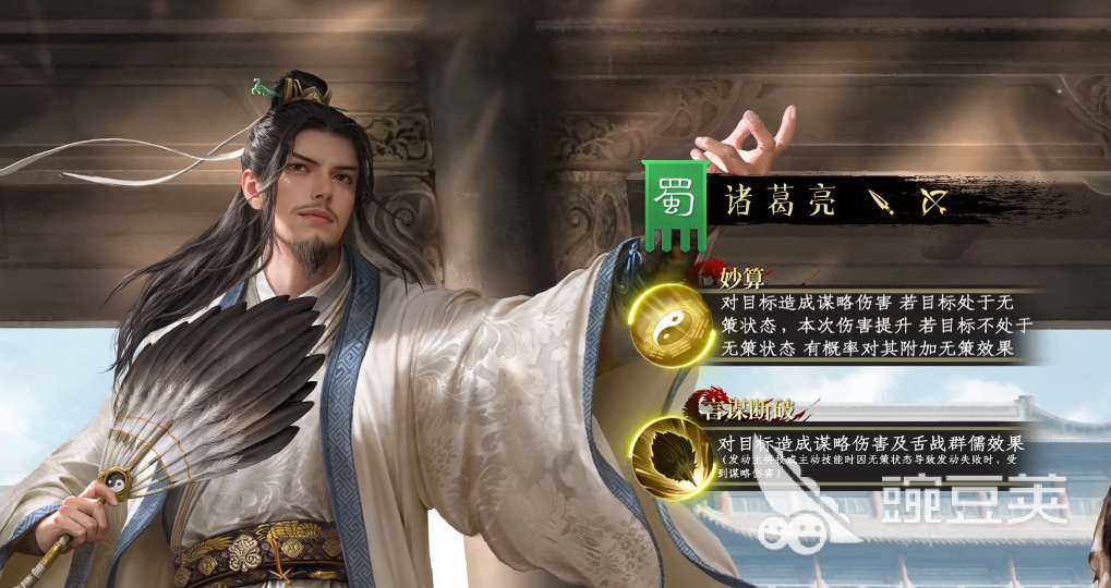 最后为大家介绍的就是诸葛亮,诸葛亮在目前的策略压制效果上面是具有非常强的代表功能的,在自己的状态效果上面可以避免被对面干扰,而且自身技能效果还可以给对面的武将造成谋略类型的伤害,如果对面的敌人敌人处于无策的状态下的话,那么诸葛亮还有50%的伤害提升,他在这样一半概率叠加无策效果的时候,还可以造成伤害的同时,附加一个舌战群儒的效果,这样的话可以让有这个效果在身的敌人在6秒之内发动主加技能的时候,额外承受出一些谋略类型的伤害,所以在诸葛亮的效果当中基本就是以攻代守的。