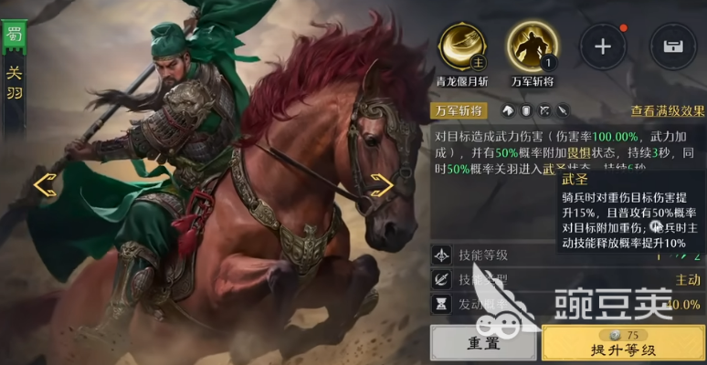 关羽置于副将位,承担主要输出职责。推荐战法组合为「斩将夺锋」与「夺神箭」,二者均以叠加“重伤”为核心机制。当目标累计承受三层重伤后,将触发“虚弱”效果——攻击力下降70%,并伴随持续掉血。若额外配置兵法「长驱直入」,可进一步提升关羽技能释放频率,保障重伤层数稳定覆盖。同时,在枪兵兵种加成下,关羽激活“武圣”状态,技能发动率额外提升10%,大幅降低空技能风险,连招流畅度显著增强。