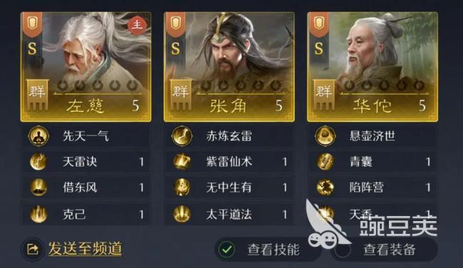 战法配置方面,华佗优先选择兼具治疗与减伤效果的技能,例如刮骨疗毒、资军后勤、天香;左慈与张角则侧重携带雷暴、借东风、太平道法、克己等高发动率谋略主动技,强化技能连锁反应与瞬时输出强度。