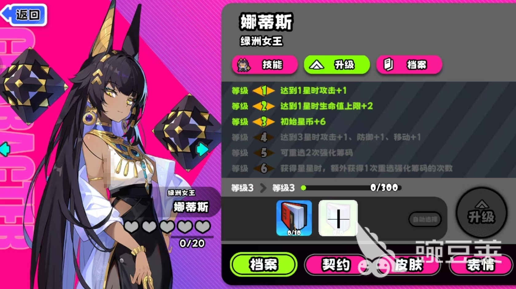 娜蒂斯的养成收益也很高,可直接养满或是先养到等级三。要知道,娜蒂斯一级时就能在自己获得一星时攻击加1的效果,二级更是能让自己在一星时生命上限加2,令她能在战斗中有着更足的底气,非战斗情况下也能避免因生命上限过低而被不明攻击砸入昏迷的尴尬情况,等级三时的初始星币加6也让娜蒂斯获得更多的启动资金,后面的等级四、五、六更是强化了她在后期的作战能力,也让她能在合作模式里能更轻松地拿到想要的筹码。