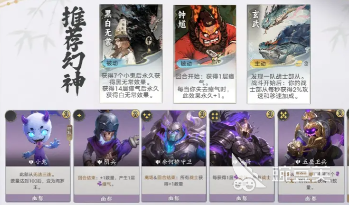 组建这一套阵容,核心就在于选择成员,一开始阴兵是主要的选择。每一个回合结束之后就能触发鬼将技能,可以给战士带来足够的数量加成。五岳卫兵,奈何桥守卫,还有玄武,就是战士数量暴涨的关键,三者技能叠加在一起,就可以迅速的扩大战士部队的规模。在这一套阵容中,小鬼就是灵魂,不仅作为战士参与战斗,出售之后也可以换取经济,数量累积到一半时,就可以直接进化,然后变成最强的战斗力阎罗。幻神的搭配就会决定阵容的上限,黑白无常就能迅速的加速小鬼的数量,在解锁之后战斗力就可以直接翻倍。