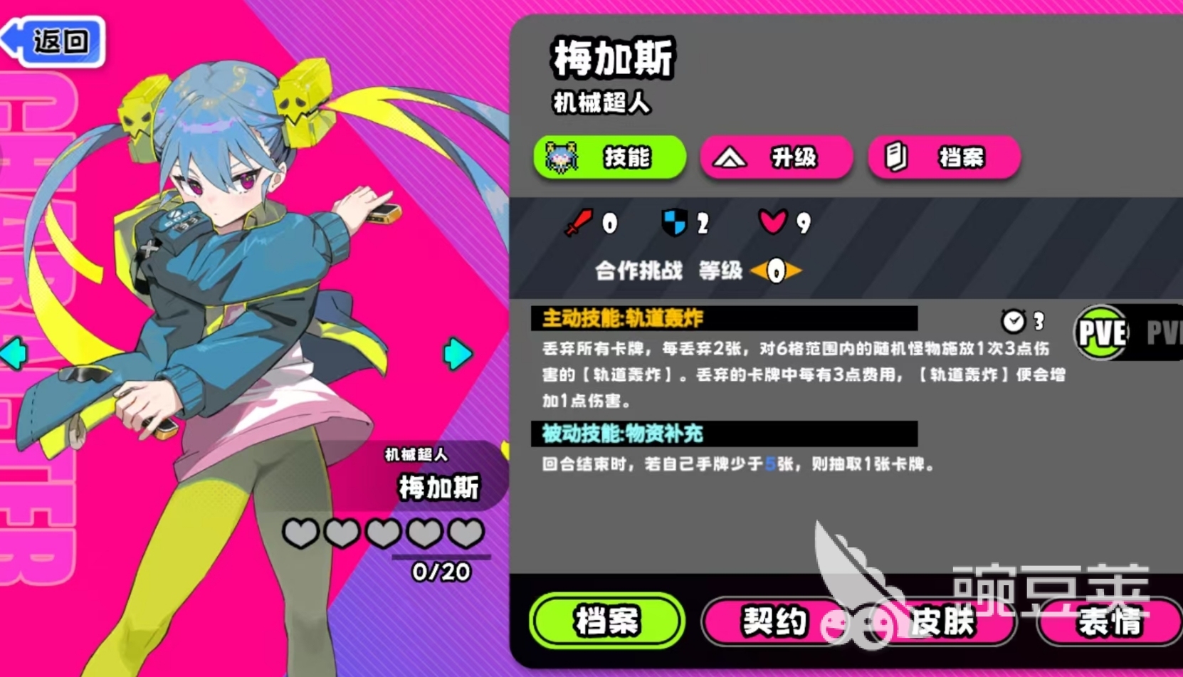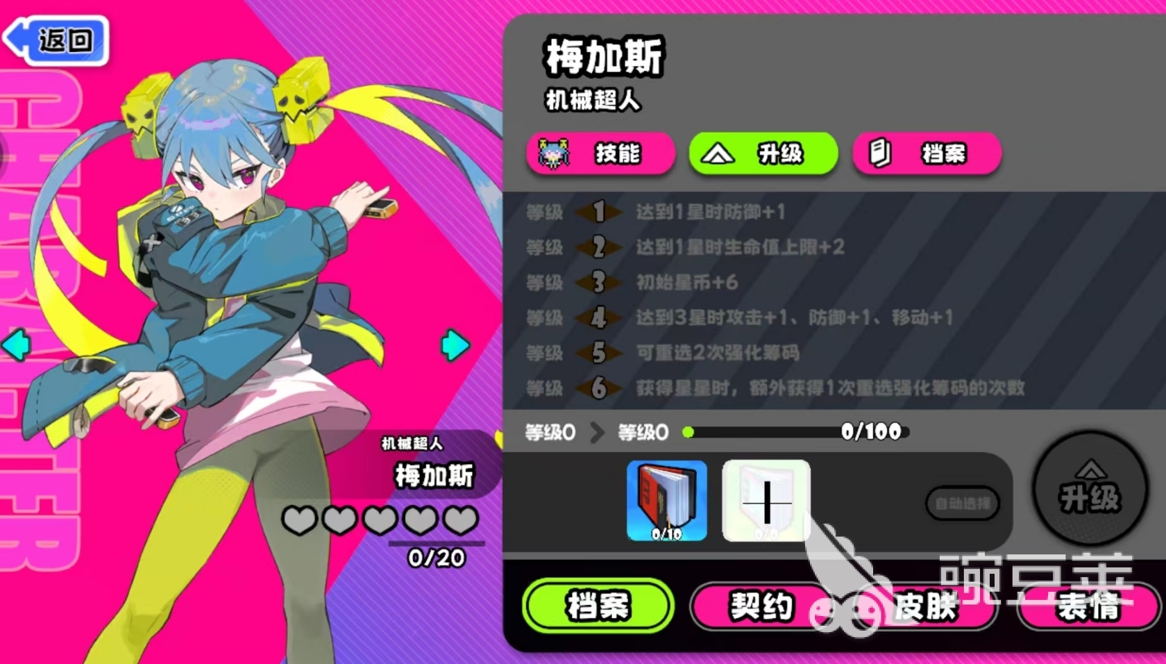 但要注意,梅加斯虽然在合作模式里能利用弃牌打伤害,但她自身没有叠攻手段,所以在面对boss敌人或精英类的敌人时,很难打出有效输出,所以还不如专门辅助其它输出队友,通过打钱、为队友加血等方式,来帮助队伍更快地在合作模式里击败地图中的boss敌人。而且从梅加斯的升级效果来看,各等级带来的攻击提升也非常少,在效果上反而更偏向星币增加、生存能力提升。当然了,在标准模式下,梅加斯依旧能凭借主动技成为强势输出。