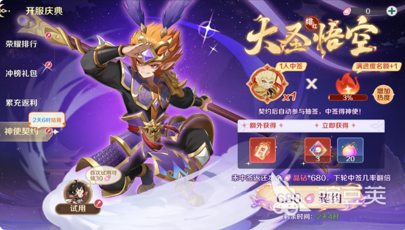 这里神使的话,基础达到的品质就是比较高的,但是前期大家获取这类使魔的概率也比较小,所以通过本期介绍,大家可以了解到目前系统当中最为推荐的两个神使,也是最好获取的,基本前期的大家通过了各种活动的话,都是可以拿到这两个神使的,首先第一个就是齐天大圣,齐天大圣这个神使的话,目前在游戏当中作为一个活动当中出现的神使,技能效果是什么效果要看大家走什么路线,他目前在整体的登场效果当中,可以根据他的金箍棒作为武器带来一定的横扫效果,而且在造成范围伤害之后还自带了一定的减速能力,所以大圣他在游戏当中擅长的效果,其实是可以给角色带来两个羁绊的。