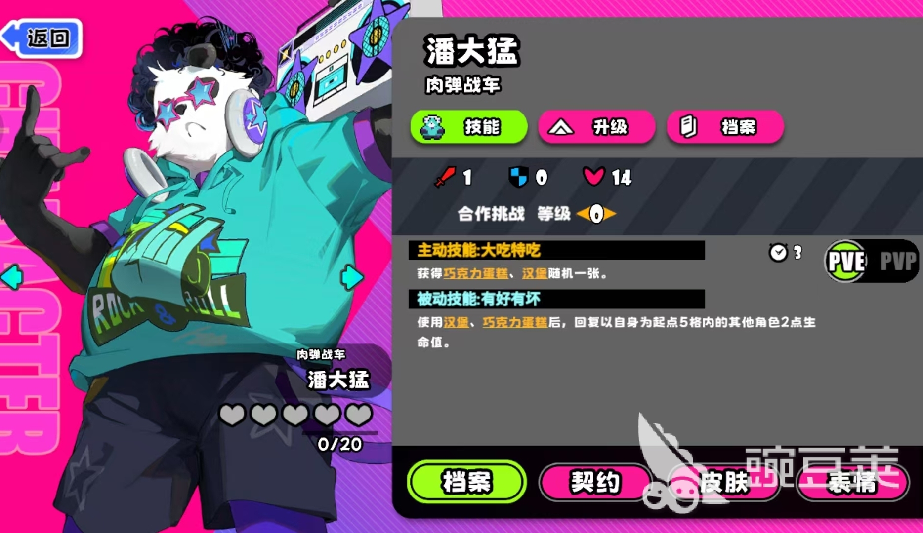 潘大猛能通过使用主动技来立刻获得手牌,但不同模式下该主动技可让潘大猛获得的手牌类型也很不一样,其中合作模式能拿到巧克力蛋糕、汉堡等能为之恢复的手牌,且他的被动也会被更改为食用这两种手牌后,能以自身所在位置为基点,为其它角色恢复2点生命,只要使用了对应的手牌就能立刻触发,不限次数。但在标准模式里,能拿到的手牌就变成自爆和以牙还牙,前者使用时除了会扣自己血外,还能让效果范围内的敌人被强制扣5点血量,后者则可帮潘大猛反弹他人对自己发动的效果手牌。