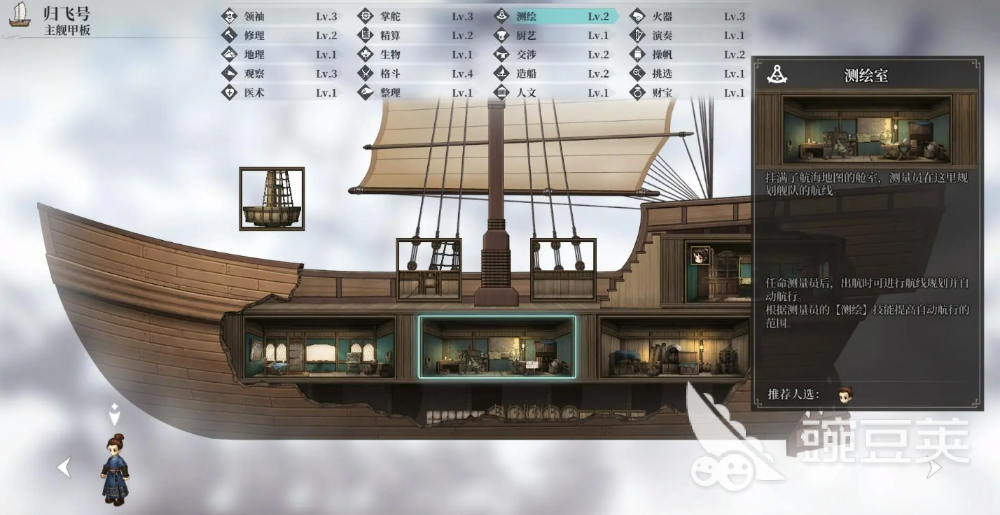出海之前有几个地方必须要注意。瞭望台一定要安排人手,这样在航行途中就能发现宝藏或者沉船,这些都是不错的收入来源。另外测绘室也很重要,有人在那里工作的话就可以开启自动航行功能,能省下不少操作时间。前期的船只老化速度比较快,要时刻留意船体的状况,千万别开到一半船散架了。等后面能任命船匠之后,就可以随时修船,这个问题也就不算大问题了。