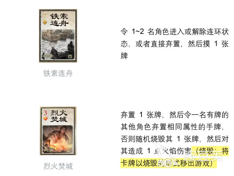 战法牌又涵盖了锦囊牌,不过两种牌型都有着不同的技能效果,比如说铁索连舟这张战法牌就能直接使场上的1到2名角色进入到连环状态中,当然也能够解除连环状态哦,烈火焚城则能够放置1张牌,然后让有牌的敌人将相同属性的手牌给放弃,若是不放弃的话会将对方的1张手牌给烧毁。