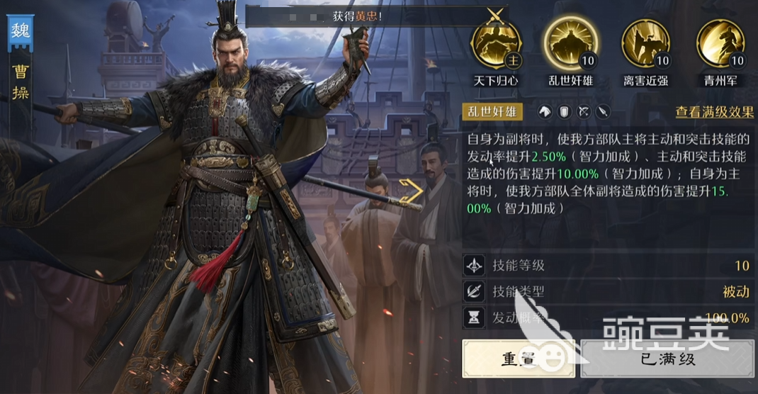 曹操的核心能力源自被动技【反戈一击】:每当受到普通攻击或战法伤害时,有概率对攻击者造成固定比例的反击伤害;该技能触发率与伤害倍率随战法等级同步提升。这一机制使其既能承担前排承伤职能,又可持续反制敌方输出单位,具备主C与辅助双定位潜力,在队伍中可灵活适配多种战术需求。