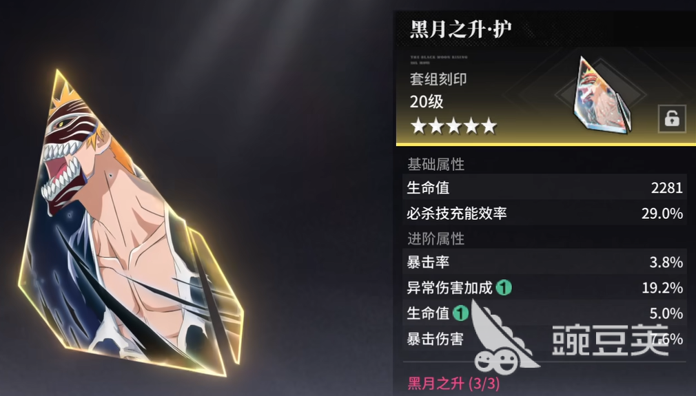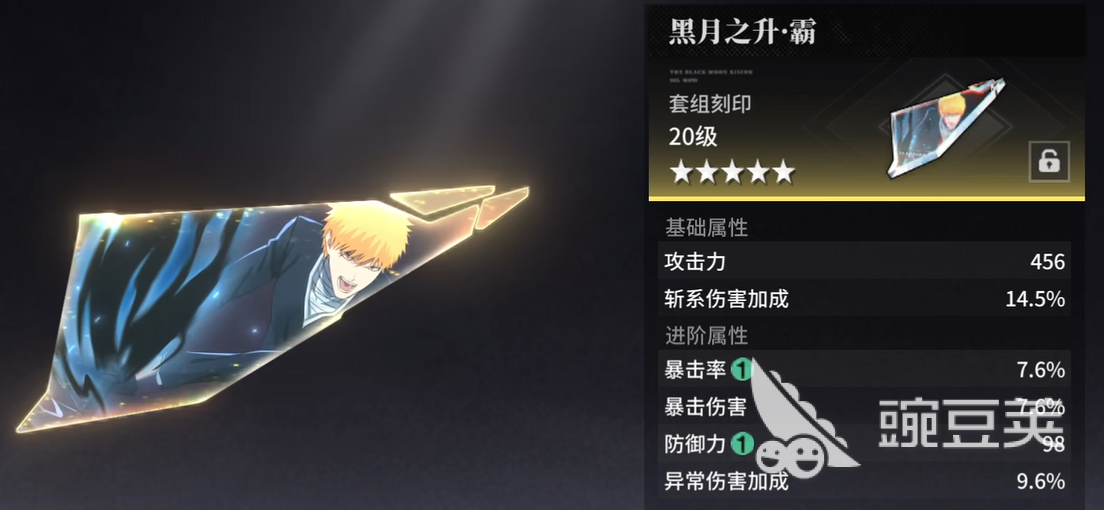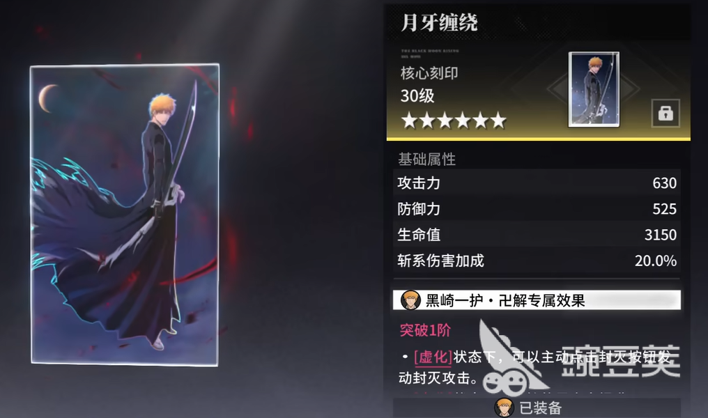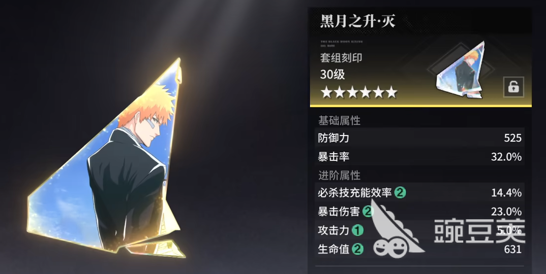 先说套组刻印的三个位置。第一个位置是黑月之升-霸,主属性是随机的,最好能刷出斩系加成。因为卍解一护的输出主要靠斩系伤害,这个属性加成直接影响技能倍率。第二个位置黑月之升-灭,建议选暴击率。有人可能觉得暴击伤害更好,但其实卍解一护有个被动机制,暴击率超过100%之后,每多出1%就会转换成1.5%的暴击伤害。所以堆暴击率对他来说收益更高,不会浪费。第三个位置黑月之升-护,这个位置主属性选必杀技能充能效率。卍解一护打输出很依赖必杀技,充能快了才能频繁放大招,输出循环才顺畅。
