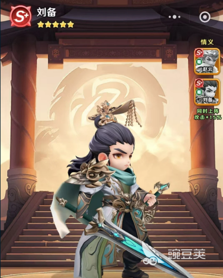 赵云和刘备之间还有另一层羁绊关系。赵云血量掉到百分之四十以下的时候,会自动进入保命状态,持续两秒左右,同时还会获得一个护盾效果。这个护盾比较特殊,不能被敌人的技能驱散掉。刘备这边则是最大生命值会增加,每回合开始时还能恢复一定血量。两个人配合起来,整个队伍的生存能力会明显提高。