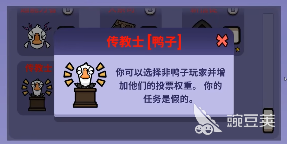 传教士是《鹅鸭杀》反派阵营中极为特殊的非暴力角色,不依赖击杀行为,而是通过强化投票机制影响局势走向。其核心能力为提升己方玩家在投票阶段的踢人成功率,尤其在人数密集的房间中效果显著。完成任务后可主动向鹈鹕施放增益,大幅提高其被投票淘汰的概率;同时,该角色拥有全局票型可视化权限,能精准识别模仿者、中立角色及伪装的好人,为团队提供关键推理依据。