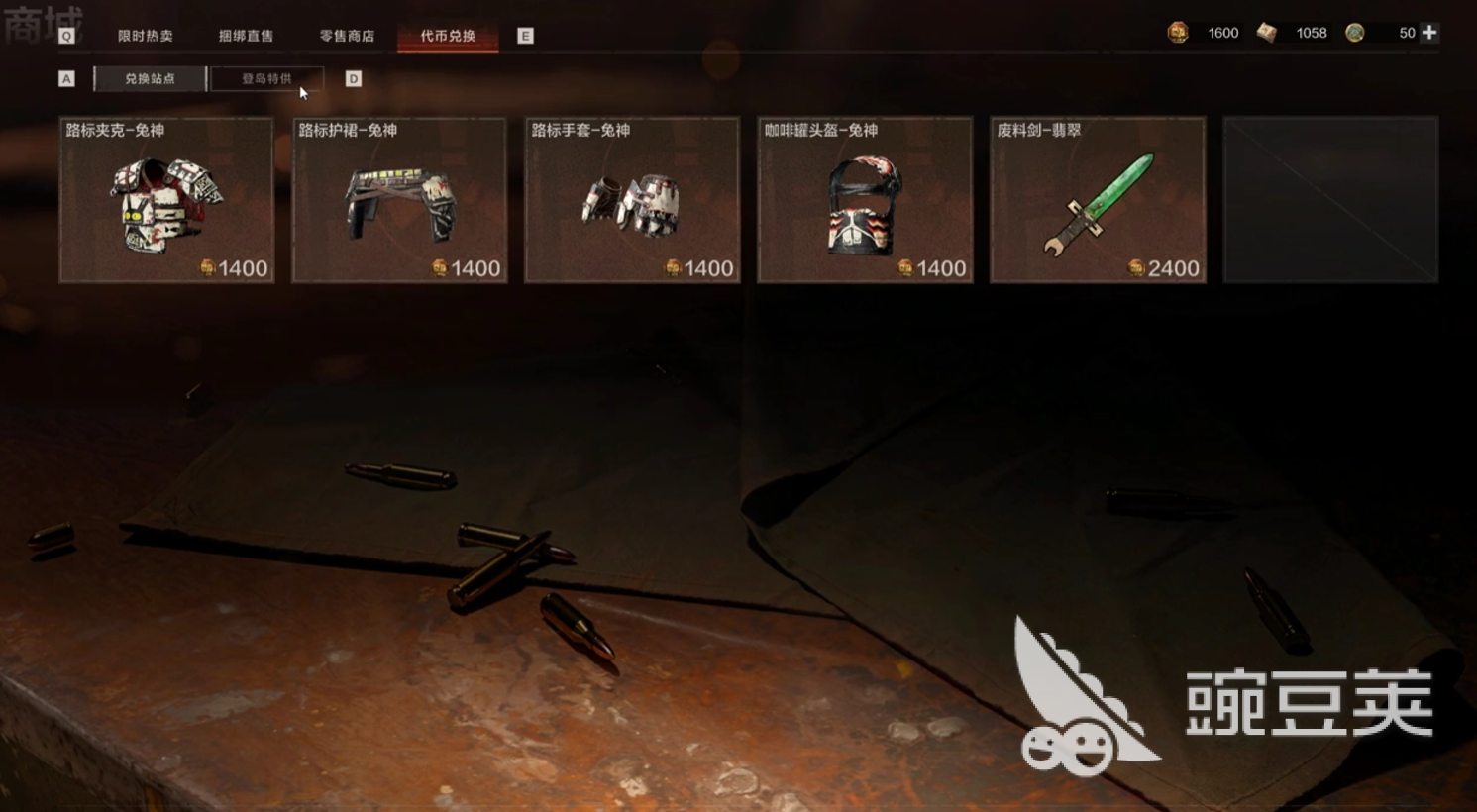 然后他在商城中还有着一个代币兑换的商店,在这个代币兑换的商店中,这个代币兑换的又是另外一个兔神系列,玩家们能够获取这个系列的路标夹克、路标护裙、路标手套、以及咖啡罐头盔和废料剑的新皮肤,一共有5个物品可以让玩家们获取,除了废料剑需要2400的代币,其余每一个物品获取需要的都是1400代币。