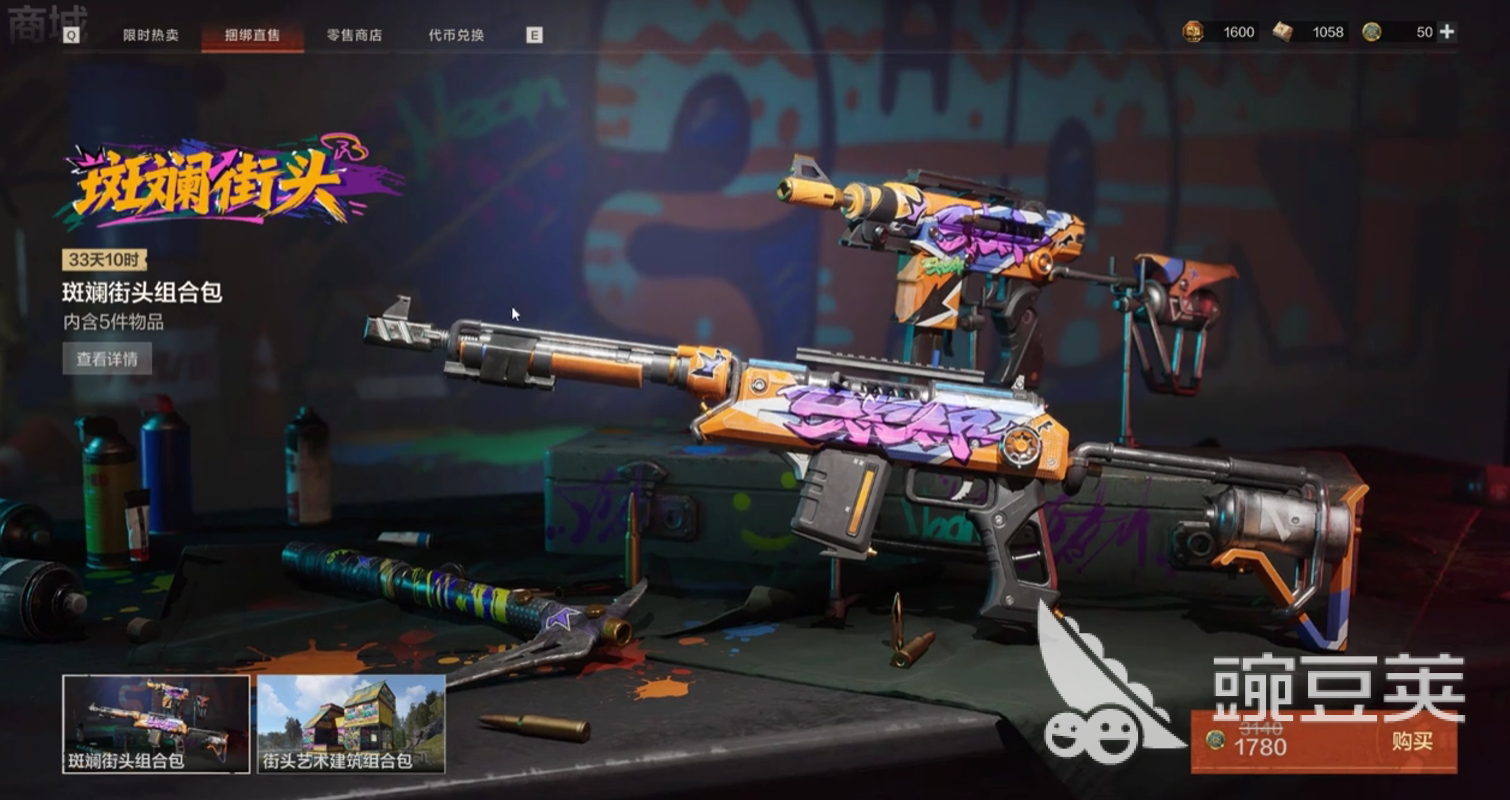 最后就是商城中的零售商店,这些都需要玩家们充值货币,游戏在这个商店之中,玩家们拥有着ak47的浅灰沙滩皮肤,以及废料件,大砍刀、匕首和改名卡都可以进行购买,玩家们可以选择自己心仪的物品进行获取,随后就是商城中的捆绑直售系列,此次的捆绑直售物品是以斑斓街头这个主题为主,这个主题甚至拥有着街头艺术建筑组合,在这个商城之中不仅拥有着冲锋枪,还拥有着半自动步枪的系列皮肤,不过这些皮肤玩家们都需要单独购买,并且注意,这些物品并不属于通行证之中。