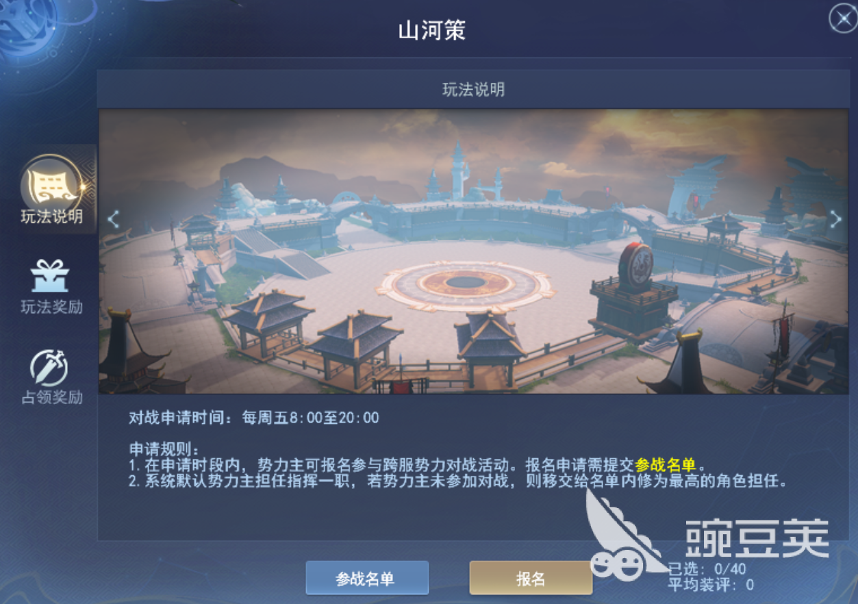 参与山河策需严格遵循时间与流程规范:报名窗口为每周五上午8:00至晚上20:00。报名由势力首领或指定管理角色(尚书)统一提交,每支参战势力最多可登记40名成员。系统将基于整体战力水平,智能匹配四支实力相近的势力组成一场对局,确保竞技公平性与对抗强度。