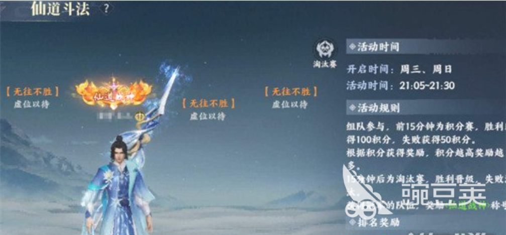 游戏需要玩家以组队的形式参与竞技,活动前15分钟为积分赛,在积分赛中胜利的队伍每个成员能够获得100积分,失败的队伍则能够拿到50积分,在活动中队伍会根据积分获得的数量来决定奖励的丰厚程度,积分越高的队伍能够拿到奖励也就越丰富,若是队伍拿到了冠军的话,那玩家将会获得仙道战神的称呼。