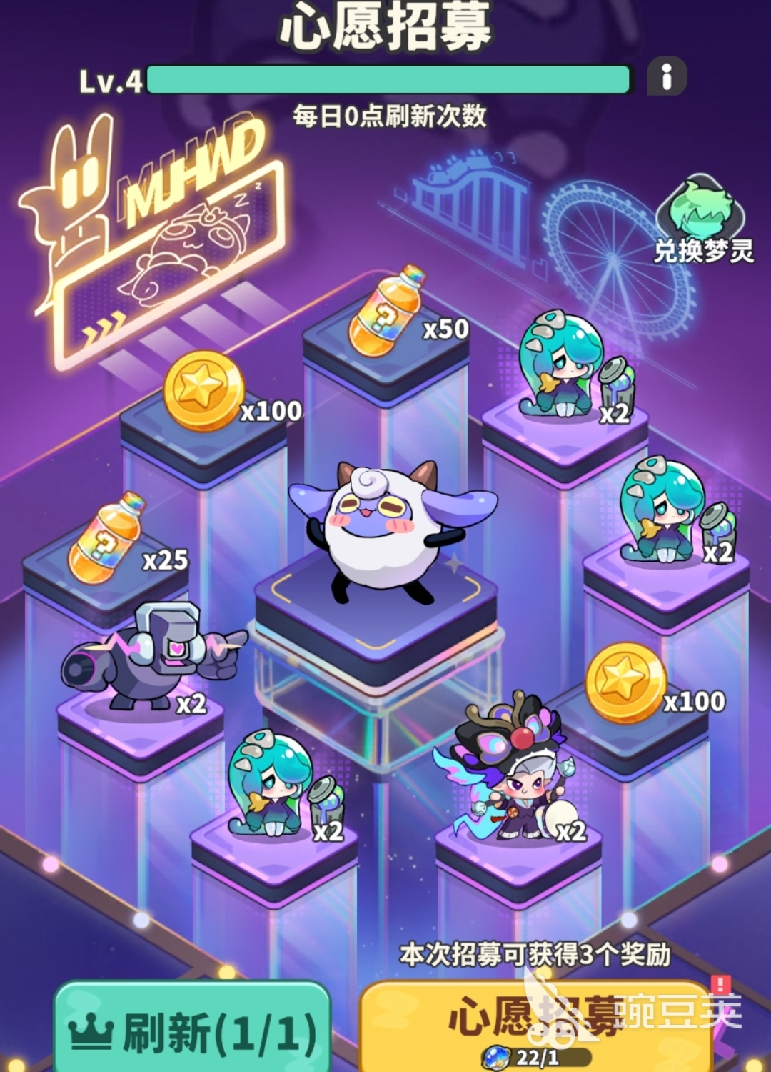 此外,玩家每在梦灵招募卡池里招募10次梦灵,都能获得1点梦愿水晶积分,集齐10点后可兑换1颗梦愿水晶。该道具可在梦灵招募中的心愿招募中使用,游戏会随机给出9个不同的商品,里边有梦灵碎片、养成材料等,在抽取时只会抽出9个商品里的物品,每1颗梦愿水晶抽取1次,直至玩家将所有的商品都抽走或是进行商品刷新,既玩家们能百分百抽取刷取出的商品。同时,心愿招募中高品级梦灵碎片出现的概率也会随着卡池等级的提升而增加,且它刷出高品级梦灵的概率要比梦灵招募卡池高。