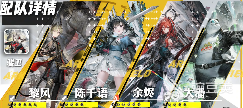 物理队的六星干员骏卫,身为全游戏面板最高之一的干员,虽然身为先锋职业,但超高的攻击力已然让他不输于任何一位输出干员,近卫的输出非常依赖高层数的破防状态,因为他的战技可以碎甲消耗所有的破防状态,基于消耗破防的层数来回对应的距离,当消耗破防后,可以激活他的连携技,根据消耗破防的层数,伤害会有对应的提升,骏卫的配队参考为骏卫、黎风、陈千羽或余烬,还有大潘,这个阵容的黎风可以造成物理脆弱,还可以获得连击buff,当然没有黎风也可以换成小羊,陈全羽或余烬,稳定叠加破防层数大,任何位置都可以消耗掉破防层数。