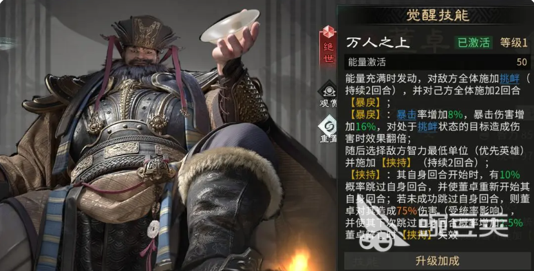 而这里给董卓搭配这个动作,主要是因为他能够带来的技能效果当中可以根据对全体敌人的挑衅,来施加我方角色身上的暴击以及暴击伤害,这样我方虽然玩的是一个控制队,但是输出也不差,而针对敌方针率最低的一个单位带来的一个控制效果叫做挟持,这个挟持在其中就是让对面武将有10%的概率会跳过他们行动的那个回合,并且此时动作它会有一个自身回合行动更新的能力,所以通过这个状态来说的话,大家不仅可以给到对面更多的控制,还可以让角色行动的次数更多一些,他通过这样的一个觉醒技能是嫁给对面的一些减益,更多的同时还可以给我方带来足够的暴击爆伤。