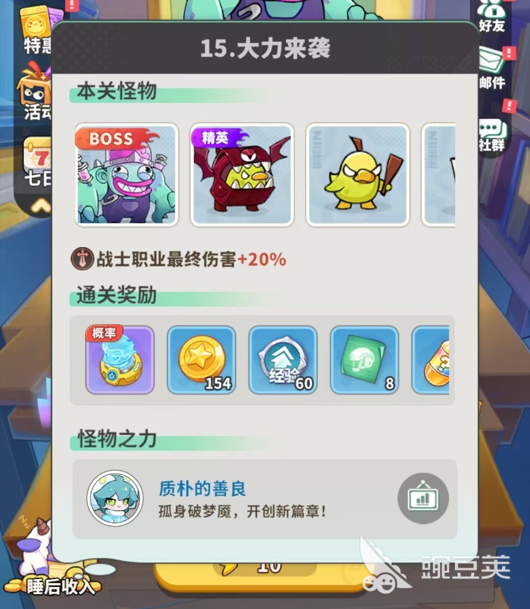 正式进行关卡挑战时,主拿射手梦灵或毒系梦灵的强化效果,它们中哪个出得比较多就以对应的梦灵为主输出,好的挂件也优先给该梦灵装上。若是生存上有压力,也可拿一些能提升甜心护士回血能力的强化效果,确保整支队伍的血线不会过低,亦或多去强化下队长的装备,好令梦灵们的攻击与生命都能得到提升。此外,本关的通关难点在于最终的boss没头脑,若是不慎被它带走几名梦灵无法完成三阶通关的目标,玩家可先去挑战下一关,等练度升上来后,再返回来挑战,这样会轻松许多。