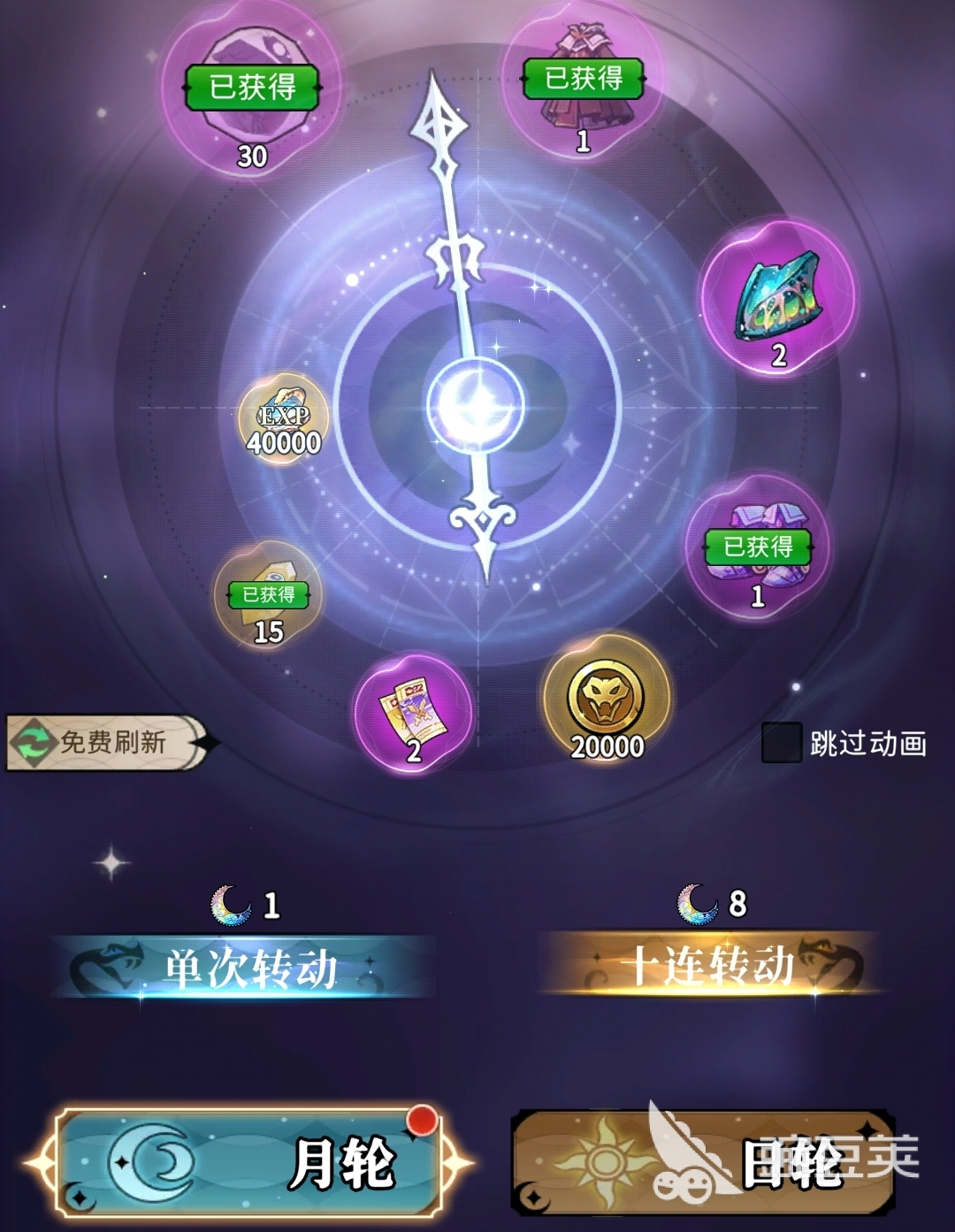 日月轮分为月轮与日轮,其中月轮可抽取出高级蛇灵结晶、橙色武器等物品,也能获得探索卷、蛇鳞等各类资源,每次转动日月轮都需要消耗一个月之匙,集齐十个后可连转十次。日轮与月轮有着同样的转动机制,但它消耗的是日之匙,玩家可以从中获得橙色装备、特定的蛇灵结晶等,其中特定的蛇灵结晶在收集满50个后,可合出特定蛇灵。