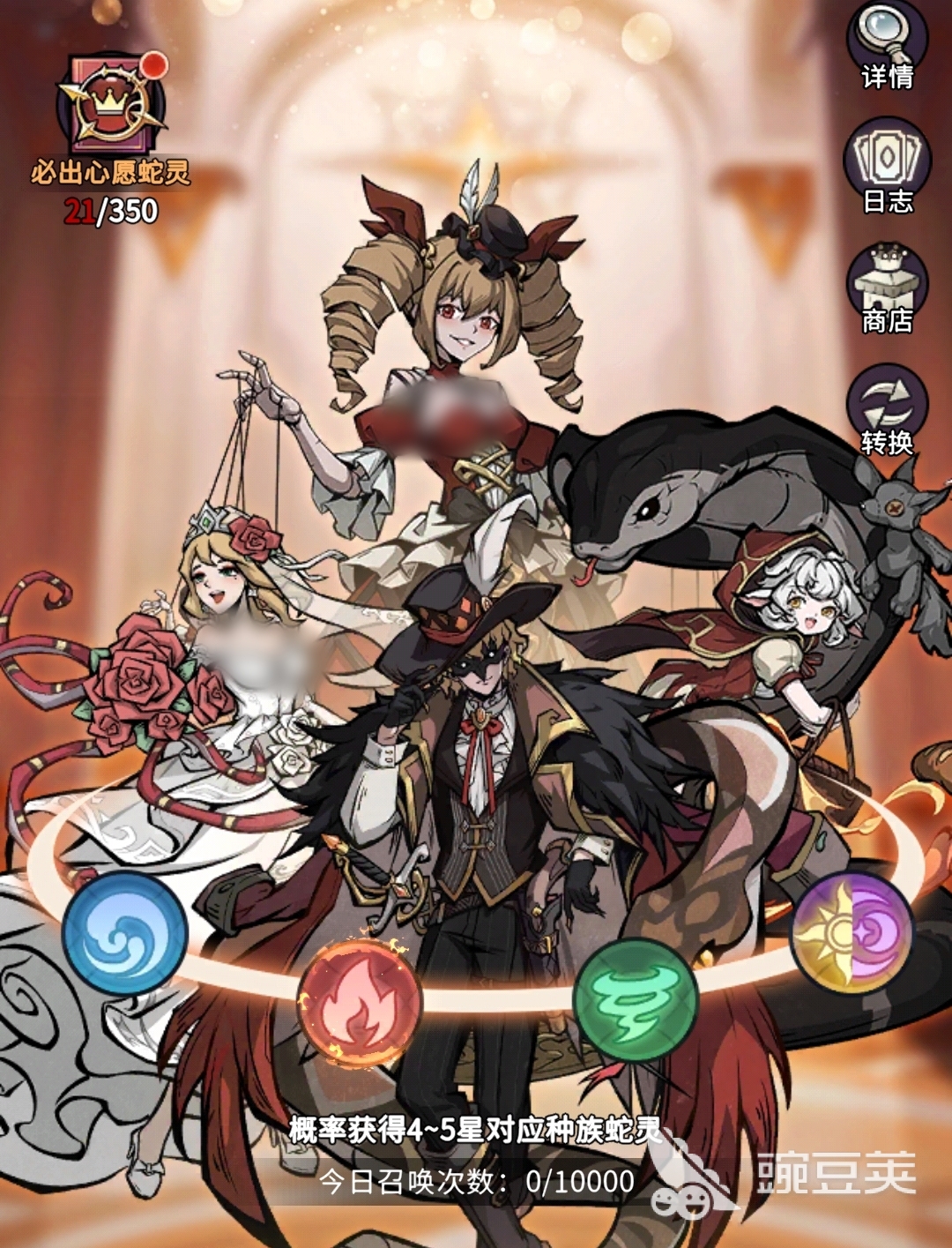 蛇灵召唤是人们最常用的许愿树功能,各位可在里边进行蛇灵的抽取。它分为基础召唤、高级召唤和友情召唤三种,其中基础召唤使用蛇鳞来抽取,可抽出2至5星蛇灵,高级召唤则用蛇牙来抽取,只会出现3至5星蛇灵。友情召唤需要消耗好友增送给自己的金玫瑰,100朵金玫瑰可进行一次抽取,与基础召唤一样能抽出2至5星蛇灵。