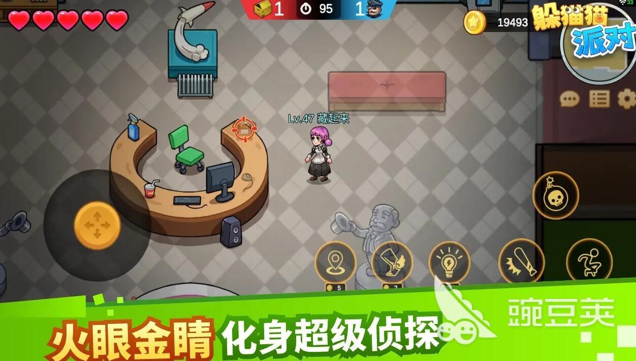 《躲猫猫派对》采用的是5v15的非对称性模式,分为躲藏者和寻找者两大阵营,各自阵营的玩家需要按照身份来进行游戏。对于躲藏者来说,可以化身为花瓶和书本等各种事物完美融入环境。而搜寻者的目的就是使用探测仪等特殊装备来找出躲藏者。游戏中为两个阵营提供了数十种可以使用的特色道具,且部分地图还会因环境影响而增加难度,喜欢捉迷藏的玩家可以尝试。