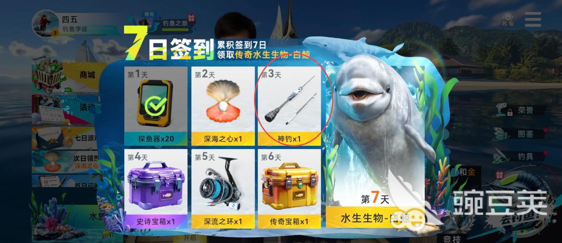 在这个游戏里想要获得高级鱼竿,就可以参与特定的钓鱼任务,里面会不定期的推出一些钓鱼竞技比赛,只要能在比赛中获得对应的名次,就能得到高级鱼竿,另外每一次顺利钓上鱼之后,玩家还可以获得大量的货币奖励,可以直接用这些货币购买一些高级鱼竿,利用这些高等级的设备,玩家可以去深海里垂钓体积更大的鱼类,借助这些高级鱼竿,玩家可以去特定的位置得到更珍惜的鱼种,每个玩家都可以在后期通,过上面的两种方式获得更高等级的鱼竿。前期有一个7日登陆的活动,登陆第三天就可以获得【神钓】这把高级鱼竿。