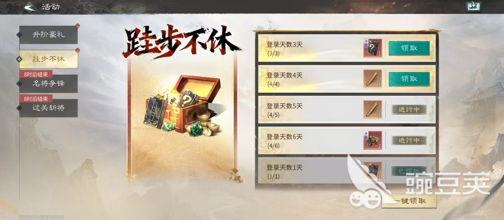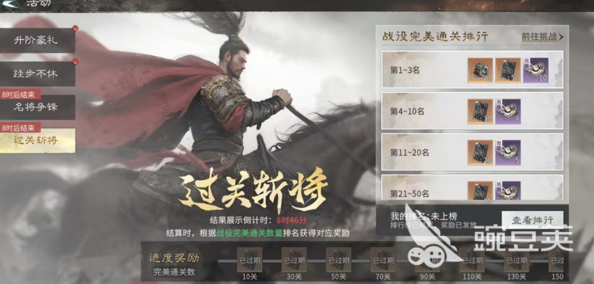 过关斩将活动也不应该错过,如果完美通关,前面三名就能拿到专属的皮肤以及限定道具。建议翻出目前没有拿完美评价的关卡,调整武将阵容,确保通关时全员可以存活,时间可以达标。每补一关就会距离前面三名更进一步,奖励的含金量还是很出色的。前面一到三名可以直接领一个专属的武将皮肤,10个限定道具,50本技能书。皮肤不仅好看,还可以增加武将属性,4~10名有30本技能书,还有8个限定道具,足够让你的核心武将继续的完成突破。