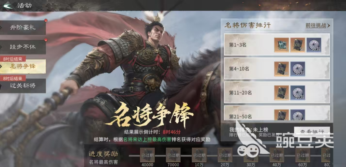 名将争锋根据活动结算的内容来看,大家可以先选择名将访上,前面三名就能获得50万的资源以及稀有的道具。在冲榜时也有一些小技巧,例如就需要选择养的比较好的武将,把他的装备还有技能全部的拉满。同时还需要带满意buff去攻击。尽可能刷出最高的伤害,奖励的梯度必须要拿捏好。前面的一到三名,可以直接拿走一个玉髓道具,以及50万的资源,50本的英雄技能书。4~10名就可以拿到30本技能书,还有30万的资源,足够支撑武将升两个大阶级。