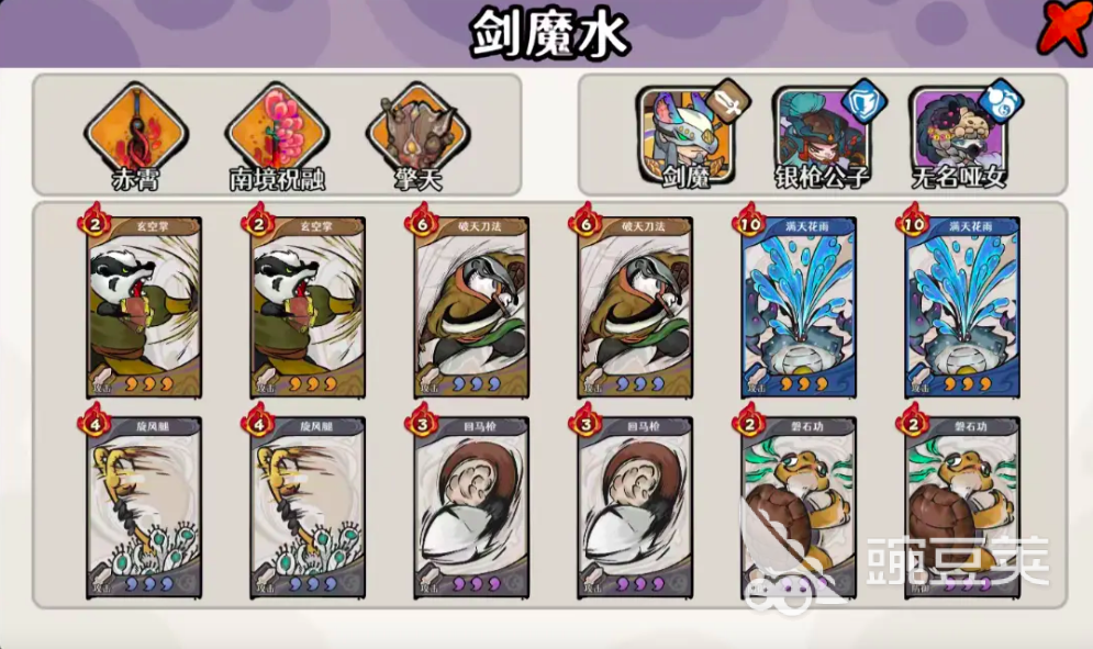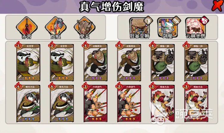 第二组是真气增伤流,不过这一组的整体造价会偏高,神兵方面依旧是晴天为优先最高级。其次是赤霄和赤痕,在武侠搭配上可将玉兔换做云林圣僧,但必要条件是云林圣僧达到2命;卡组的话依旧沿用剑魔的8张老组合模式,再搭配4张攻击为主的灼烧型卡牌。